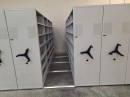 Изготовили полочные передвижные шкафы на рельсах с замковыми механизмами. Доступ возможен только через крайние стеллажи с замками и распашными дверями, что защищает хранимое от несанкционированного доступа, пыли и света. Для удобства работы дополнительно добавили выдвижные полки и архивную тележку.