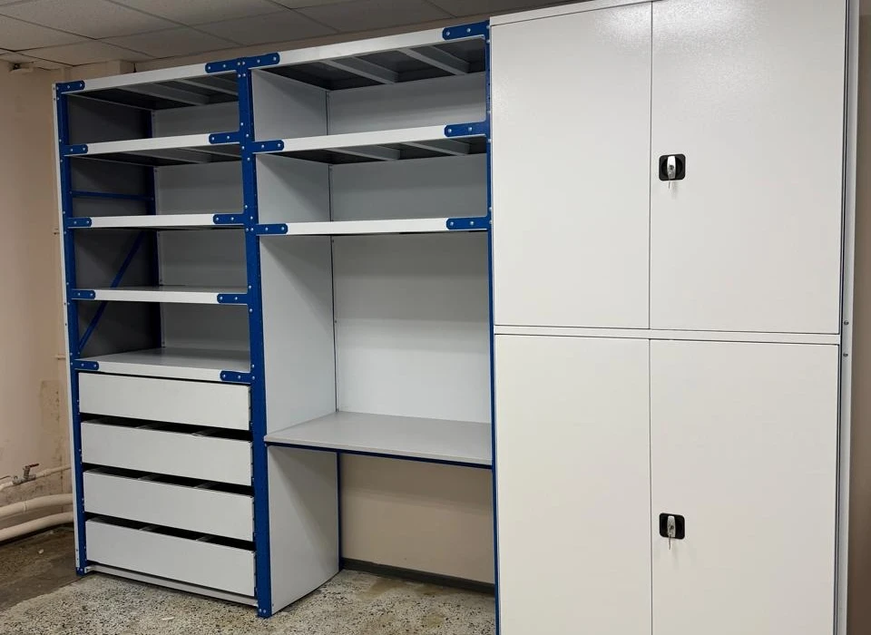 Секции металлических стеллажей можно сформировать в комплекс с рабочим местом, укомплектовать выдвижными ящиками с нагрузкой до 200 кг, дверями, выдвижными полками, лампой подсветки и другими деталями.