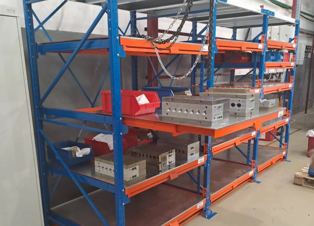 Стационарные стеллажи с полками частичного выдвижения, которые предназначены для удобного хранения оснастки, инструмента и других предметов. Оснащены механизмом защиты, который предотвращает одновременное выдвижение полок и обеспечивает безопасность использования. Нагрузка на полку стеллажа до 1 000 кг.