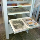 Стеллажи с наклонными полками используются для выкладки образцов периодических изданий в библиотеках.