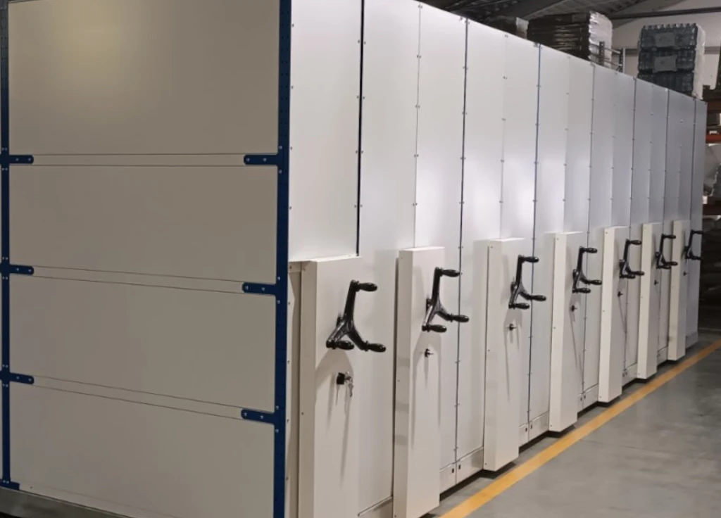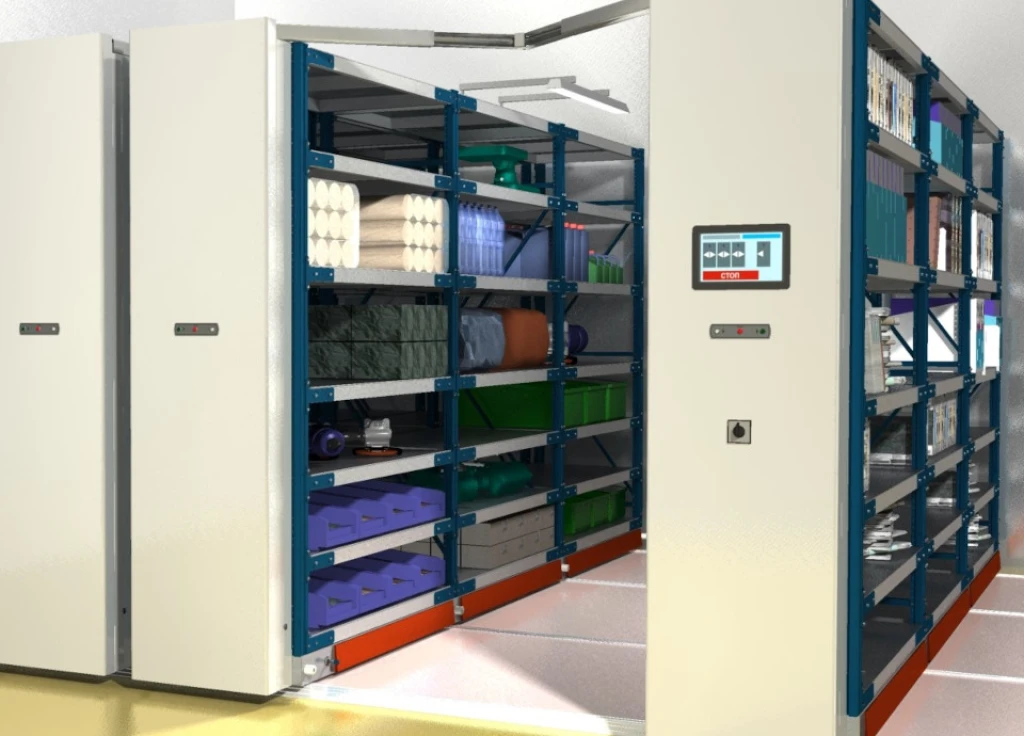 Среднегрузовые передвижные стеллажи закрывающиеся дверями жалюзи для склада и других по назначению помещений.
